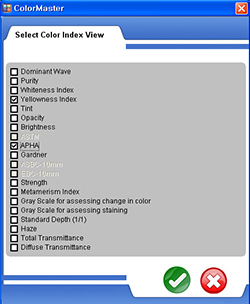 (2) Figure 1À» ¹ÙÅÁÀ¸·Î Measuring Parameter¸¦ ¼³Á¤Çϰí, ¸ÞÀΠȸéÀÇ Select Color Index ¿¡¼ APHA ¹× Yellowness ¸¦ ¼±ÅÃÇÕ´Ï´Ù.