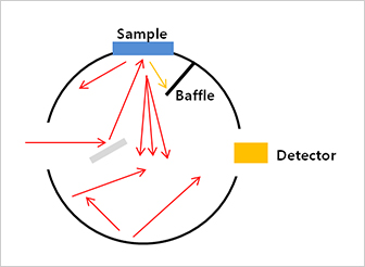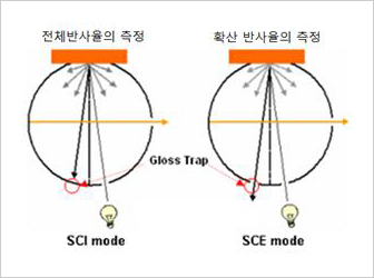 ÀûºÐ±¸¸¦ ÀÌ¿ëÇÏ¿© ¹Ý»çµµ¸¦ ÃøÁ¤ÇÏ´Â ¹æ¹ý¿¡´Â SCI(Specular Component Inclusion)¿Í SCE(Specular Component Exclusion) µÎ °¡Áö°¡ ÀÖ½À´Ï´Ù. SCI´Â Àü¹Ý»ç, Áï ³¹Ý»ç¿Í Á¤¹Ý»ç ¸ðµÎ ÃøÁ¤ÇÏ´Â ¹æ¹ýÀ̸ç, SCE´Â Á¤¹Ý»ç¸¦ Á¦¿ÜÇÑ ³¹Ý»ç¸¸À» ÃøÁ¤ÇÏ´Â ¹æ¹ýÀÔ´Ï´Ù. ±âº»ÀûÀ¸·Î ÀûºÐ±¸´Â Àü¹Ý»ç¸¦ ÃøÁ¤ÇÏ´Â µµ±¸ÀÌÁö¸¸ Á¤¹Ý»ç°¡ ¹ß»ýÇÏ´Â À§Ä¡¿¡ °¡¸²¸·(baffle)À̳ª trapÀ» ¼³Ä¡ÇÏ¿© ³¹Ý»ç¸¸À» ÃøÁ¤ÇÏ´Â °ÍÀÌ °¡´ÉÇÕ´Ï´Ù (Figure 2).