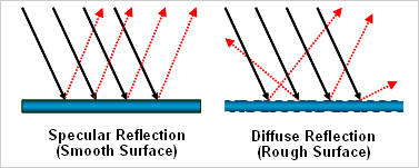°íü ½Ã·á¿¡ ºûÀ» ÀÔ»ç½Ã۸é, ½Ã·áÀÇ Ç¥¸é¿¡¼´Â ¹Ý»ç°¡ ÀϾ´Âµ¥, Ç¥¸é »óÅ¿¡ µû¶ó Å©°Ô µÎ °¡Áö ÇüÅÂÀÇ ¹Ý»ç°¡ ÀϾ°Ô µË´Ï´Ù. °Å¿ï°ú °°ÀÌ Ç¥¸éÀÌ ¸Å²ô·¯¿î »ùÇÃÀÇ °æ¿ì ÀԻ簢°ú ¹Ý»ç°¢ÀÌ °°Àº Á¤¹Ý»ç (°Å¿ï ¹Ý»ç ; Specular Reflection)°¡ ÀϾ´Â ¹Ý¸é °ÅÄ£ Ç¥¸éÀÇ »ùÇÿ¡¼´Â ÀԻ簢°ú ´Ù¸¥ °¢µµ·Î ÀϾ´Â ³¹Ý»ç (È®»ê ¹Ý»ç ; Diffuse Reflection)°¡ ³ªÅ¸³³´Ï´Ù (Figure 1). ÀϹÝÀûÀÎ °æ¿ì Á¤¹Ý»ç¿Í ³¹Ý»ç°¡ ÇÔ²² ¹ß»ýÇϴµ¥ À̸¦ ÅëÆ²¾î Àü¹Ý»ç (Àüü ¹Ý»ç Total Reflection)¶ó°í ÇÕ´Ï´Ù.