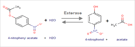 EsteraseÀÇ È°¼ºÀ¸·Î ÀÎÇØ ±âÁúÀÎ p-Nitrophenyl Acetate(pNPA)°¡ °¡¼öºÐÇØ µÇ¸é¼ p-nitrophenol(pNP)°ú acetate¸¦ »ý¼ºÇÑ´Ù. (Figure 1) p-NP´Â ¾à 404 nm ¿¡¼ ÃÖ´ë Èí±¤°ªÀ» °®´Âµ¥ À̸¦ ÃøÁ¤ÇÔÀ¸·Î esterase