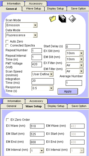 FS-2 FluoroMaster ¼ÒÇÁÆ®¿þ¾îÀÇ wave scanmode¿¡¼ ÃøÁ¤¿¡ ¾Ë¸ÂÀº ÀԷ°ªÀ» ¼³Á¤ÇÑ´Ù. ( ±×¸².3 Instrument parameter ÂüÁ¶ ¿ä¸Á) |