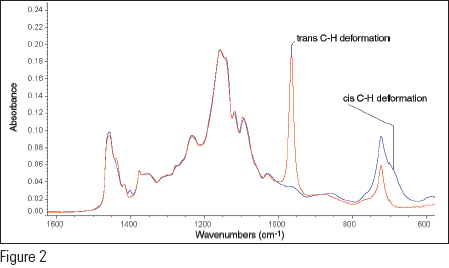 Figure2ÀÇ Trielaidin (100% trans)¿Í Triolein (100% cis)¿¡ ´ëÇÑ ½ºÆåÆ®·³¿¡¼ º¸µíÀÌ, FT-IR ½ºÆåÆ®·³¿¡¼´Â cis¿Í trans¿¡ ´ëÇÑ ÇÇÅ©°¡ ¼·Î ´Ù¸¥ À§Ä¡¿¡¼ ³ªÅ¸³´Ù. ÀüÅëÀûÀÎ Àû¿Ü¼± ºÐ±¤¹ý(Cd 14-95)Àº Áö¹æ»ê ¸ÞÆ¿¿¡½ºÅ׸£(FAME)¿Í Èñ¼®¿ë¸Å·Î½á Carbon Disulfide (CS2)¸¦ »ç¿ëÇÏ¿© ÃøÁ¤ÇÏ¿´´Ù. ÇÏÁö¸¸ ÀÌ´Â ¸Å¿ì ¹ø°Å·Ó°í °¨µµ°¡ Á¦ÇÑÀûÀÏ ¼ö ÀÖÀ¸¸ç, CS2ÀÇ »ç¿ëÀº À̰ÍÀº ³¿»õ ¶§¹®¿¡ ºÒÄèÇÒ ¼ö ÀÖ´Ù. ÀÌ Method´Â 0.5%±îÁö ºÐ¼®ÇØ ³¾ ¼ö ÀÖ´Ù°í ¸í½ÃÇϰí ÀÖÁö¸¸, trans ÇÇÅ©´Â Å« ÇÇÅ© ³»¿¡ shoulder ÇüÅ·Π³ªÅ¸³ª¹Ç·Î ¾à 5%±îÁöÀÇ ³óµµ ¹Û¿¡ ÃøÁ¤ÇÏÁö ¸øÇÑ´Ù.