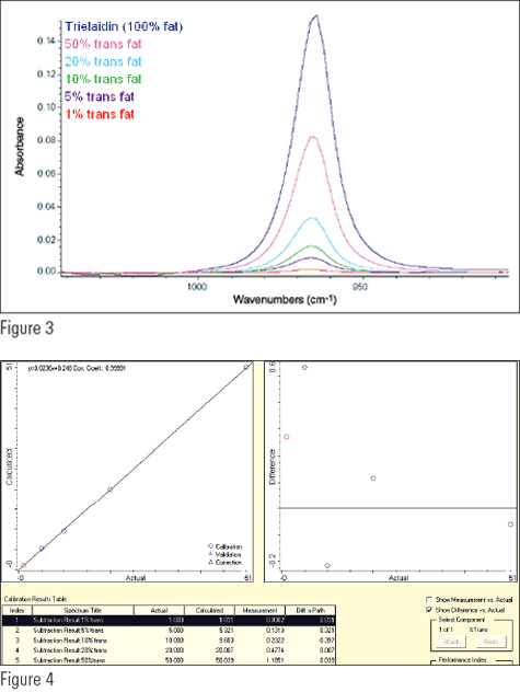 µ¥ÀÌÅÍ´Â Thermo Scientific Nicolet 380 FT-IR Spectrometer¿Í Heated Diamond ATRÀ» »ç¿ëÇÏ¿´À¸¸ç, ÃøÁ¤Á¶°ÇÀº 100 scan, 4cm-1 resolution, 65¡ÉÀÌ´Ù. AOCS Cd14d-99 Method¿¡ µû¶ó °Ë·®°î¼±À» ±×¸®±â À§ÇØ Ç¥ÁØ »ùÇ÷δ Nu-Chek Prep°¡ Á¦°øÇÑ Trielaidin (100% trans)¿Í triolein (0% trans)¸¦ »ç¿ëÇÏ¿´À¸¸ç, 966cm-1¿¡¼ ³ªÅ¸³ª´Â ÇÇÅ©¸¦ Æ®·£½º ÇÔ·®À» Á¤·® Çϴµ¥ »ç¿ëÇÏ¿´´Ù. TQ Analyst ¼ÒÇÁÆ®¿þ¾î¿¡¼ ¼±Çüȸ±Í(Linear Regression) ºÐ¼®¹ýÀ¸·Î °Ë·®°î¼±À» ¾ò¾ú´Ù. 100% Trielaidin°ú 1 ~ 50% trans Ç¥ÁØ »ùÇÿ¡ ´ëÇÑ ½ºÆåÆ®·³À» Figure3°ú °°ÀÌ ¾ò¾úÀ¸¸ç, À̸¦ ÀÌ¿ëÇÏ¿© Figure4¿Í °°Àº °Ë·®°î¼±À» ¾ò¾ú´Ù.