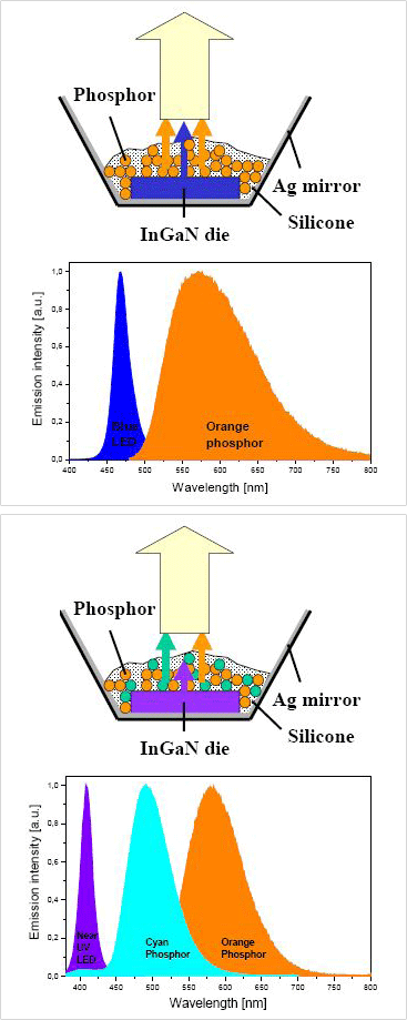 LEDÀÇ ±¤¿øÀº ÇöÀç Àû, ³ì, û, Ȳ, ³× °¡Áö ±¤¿øÀÌ °³¹ßµÇ¾î ÀÖÀ¸³ª, ±¤¿ø¸¸À¸·Î »õ·Î¿î »ö»óÀ» Á¶ÇÕÇϱ⿡´Â ±â¼úÀûÀ¸·Î³ª °¡°ÝÀûÀ¸·Î ÇѰ谡 ÀÖ´Ù. µû¶ó¼ LEDÀÇ »ö»óÀ» Á¶ÇÕÇÒ ¶§´Â ±×¸² 1°ú °°ÀÌ Æ¯Á¤ ±¤¿ø°ú ¿©·¯ »ö»óÀÇ Çü±¤Ã¼¸¦ Á¶ÇÕÇÏ¿© ¸¸µç´Ù. ¿©±â¼ »ç¿ëµÇ´Â ±¤¿øÀÌ ±Ù Àڿܼ±°ú û»ö ÆÄÀåÀ» ¸¹ÀÌ »ç¿ëÇϱ⠶§¹®¿¡, LED Çü±¤Ã¼´Â ÀϹÝÀûÀ¸·Î 300 nm¿¡¼ 500 nmÀÇ ³ÐÀº Èí±¤ Ư¼ºÀ» °®´Â´Ù.2
