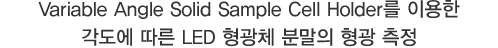 º» ½ÇÇè¿¡¼´Â »õ·ÎÀÌ °³¹ßµÈ Variable Angle Solid Cell Holder·Î ½ÇÇèÀ» ¼öÇàÇÏ¿´´Ù. ³ë¶õ»ö°ú ¿À·»Áö»ö LED Çü±¤Ã¼ÀÇ Èí±¤ ¹× ¹ß±¤ ½ºÆåÆ®·³À» ¾ò¾î ±× Ư¡À» È®ÀÎÇϰí, ÀԻ籤ÀÇ °¢µµ¿¡ µû¸¥ Çü±¤ ¼¼±â º¯È¿Í ¹Ý»çµÈ ºûÀÇ À¯ÀÔÀ» °üÂûÇÏ¿´´Ù.