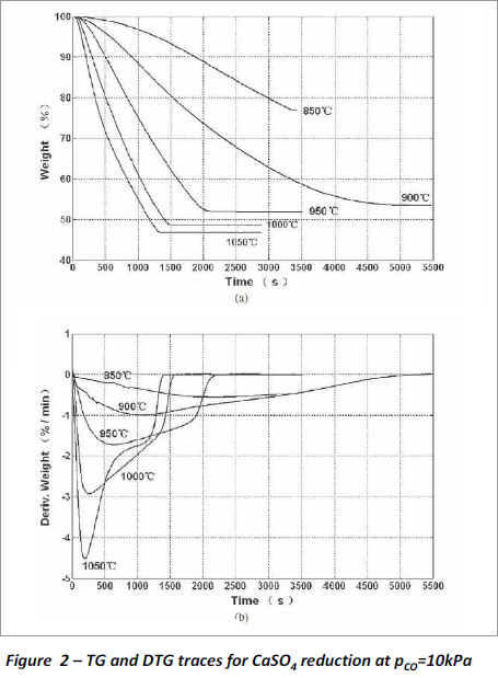 Fig. 2a¸¦ º¸¸é CaSO4ÀÇ È¯¿ø¹ÝÀÀÀÇ ¼Óµµ´Â ¿Âµµ¿¡ µû¶ó ¸Å¿ì ºü¸£°Ô Áõ°¡ÇÏ´Â °ÍÀ» º¼ ¼ö ÀÖ´Ù. Fig. 2bÀÇ DTG °î¼±(TGÀÇ ¹ÌºÐ°î¼±)À» ÅëÇØ ȯ¿ø¹ÝÀÀµ¿¾È µÎ °³ÀÇ ¿¬¼ÓÀûÀÎ ¹ÝÀÀÀÌ ¹ß»ýÇÏ´Â °ÍÀ» È®ÀÎÇÒ ¼ö ÀÖ´Ù. ÀÌ·± ȯ¿ø¹ÝÀÀ¿¡ ´ëÇÑ ½Ã°£¿¡ ´ëÇÑ µ¥ÀÌÅ͵éÀº chemical looping combustion¿¡¼ fuel reactorÀÇ À¯µ¿Ãþ(Fluidized bed)À» ¿¬±¸Çϴµ¥ À¯¿ëÇÏ°Ô »ç¿ëÀÌ µÈ´Ù.