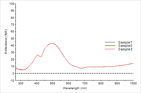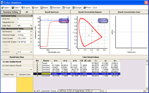 Diffuse Reflector¸¦ ÀÌ¿ëÇÏ¸é »ùÇÃÀÇ »ö»ó ÃøÁ¤ÀÌ °¡´É ÇÕ´Ï´Ù. À§ÀÇ È¸éÀº Color Analysis mode¸¦ ÀÌ¿ëÇÏ¿© ³ë¶õ»ö ÆÄ¿ì´õ¸¦ ÆÄ¿ì´õÀÇ »ö»óÀ» ÃøÁ¤ÇÑ °ÍÀÌ´Ù. |