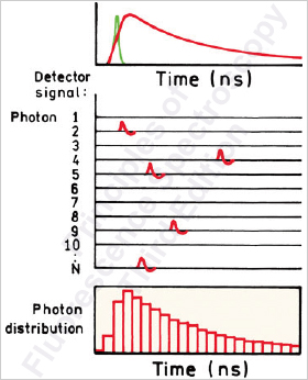 TCSPCÀÇ ½ÅÈ£¿¡ ´ëÇÑ ¿ø¸®´Â¾Æ·¡ ±×¸² 3¿Í °°ÀÌ µµ½ÄµÈ´Ù. ÆÞ½ºÈµÈ ±¤¿øÀ¸·ÎºÎÅÍ ¿©±â(Excitation)µÈ ½Ã·áÀÇ ¹æÃâ(emission)ÀÇ Àüü ½ºÆåÆ®·³Àº ¸Ç À§ ÆÄÇü°ú °°ÀÌ º¸¿©Áö¸ç, ÀÌ·¯ÇÑ ÆÄÇüÀº ¸¹Àº Çü±¤Ã¼(Fluorophores)µéÀÌ ±¤¿øÀ¸·ÎºÎÅÍ ¿©±â µÇ¾î, ¼ö¸¹Àº ±¤ÀÚµéÀÌ ¹æÃâµÇ¾î ¸¸µé¾î Áø´Ù. ±×·¯³ª Çѹø¿¡ ¹«ÀÛÀ§ ÇÏ°Ô ¹æÃâµÇ´Â ¸¹Àº ±¤ÀÚ¸¦ µ¿½Ã¿¡ ½Ã°£ º°·Î Á¤È®È÷ ÃøÁ¤ÀÌ ºÒ°¡´É Çϱ⠶§¹®¿¡, ´Ü±¤ÀÚ°è¼ö¹ýÀÌ»ç¿ëµÈ´Ù. ¿©±â¼´Â¸¹Àº ±â±âÀû Á¶°ÇµéÀÌ ±¤¿øÀÇ ÆÞ½º¾à100°³´ç ÇÑ °³ ÀÌÇÏÀÇ ±¤ÀÚ¸¸ ÃøÁ¤µÇ°Ô²ûÁ¶Àý µÈ´Ù.ÃøÁ¤ ½Ã°£Àº ¿©±âµÈ ÆÞ½º¿Í ½Ã·á¿¡¼ ¹æÃâ·ÎºÎÅÍ °üÃøµÈ ±¤ÀÚ»çÀÌÀÇ ½Ã°£À» ÀǹÌÇϴµ¥,ÀÌ ½Ã°£µéÀº ±×¸² 3ÀÇ ¸Ç ¾Æ·¡Ã³·³ ¸·´ë±×·¡ÇÁ ÇüÅÂ(Histogram)·Î °è¼öÈ µÈ´Ù.