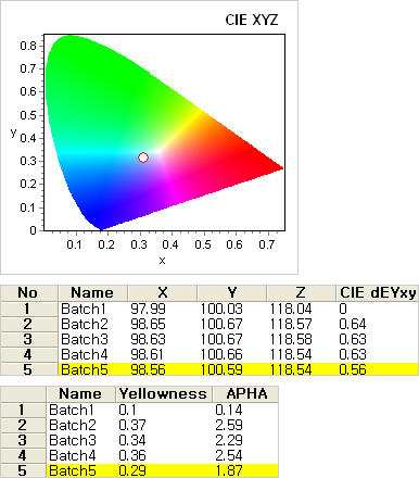 ÃøÁ¤ °ªÀº 3Â÷¿ø »öÁÂÇ¥ (CIE XYZ), APHA ¹× Yellowness µî ÃøÁ¤ Åë°è °ª µîÀ¸·Î È®ÀÎ ÇÒ ¼ö ÀÖ½À´Ï´Ù.