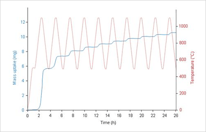 Figure 2 - mass uptake vs. time of a steel plate cycled between 500 and 1100¡ÆC under a flow of air (30 mL/min) with a TAG symmetrical TGA.