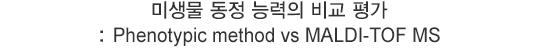 Conclusion: MALDI-TOF MS¸¦ ÀÌ¿ëÇÑ ¹Ì»ý¹° µ¿Á¤ ¹æ¹ýÀº ±âÁ¸ phenotypic method¿¡ ºñÇÏ¿© ´õ¿í Á¤È®ÇÏ°í ºü¸¥ ¹æ¹ýÀÌ¸ç °¢ Bruker Biotyper MS, VITEK MSÀÇ ¹Ì»ý¹° µ¿Á¤¹æ¹ýÀÇ ºñ±³¿¡¼ Biotyper MS°¡ ´õ ³ôÀº µ¿Á¤À²À» ³ªÅ¸³»¾ú´Ù. |