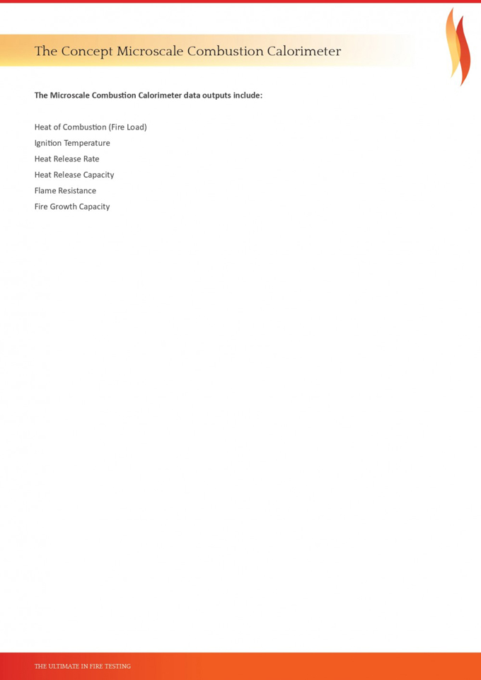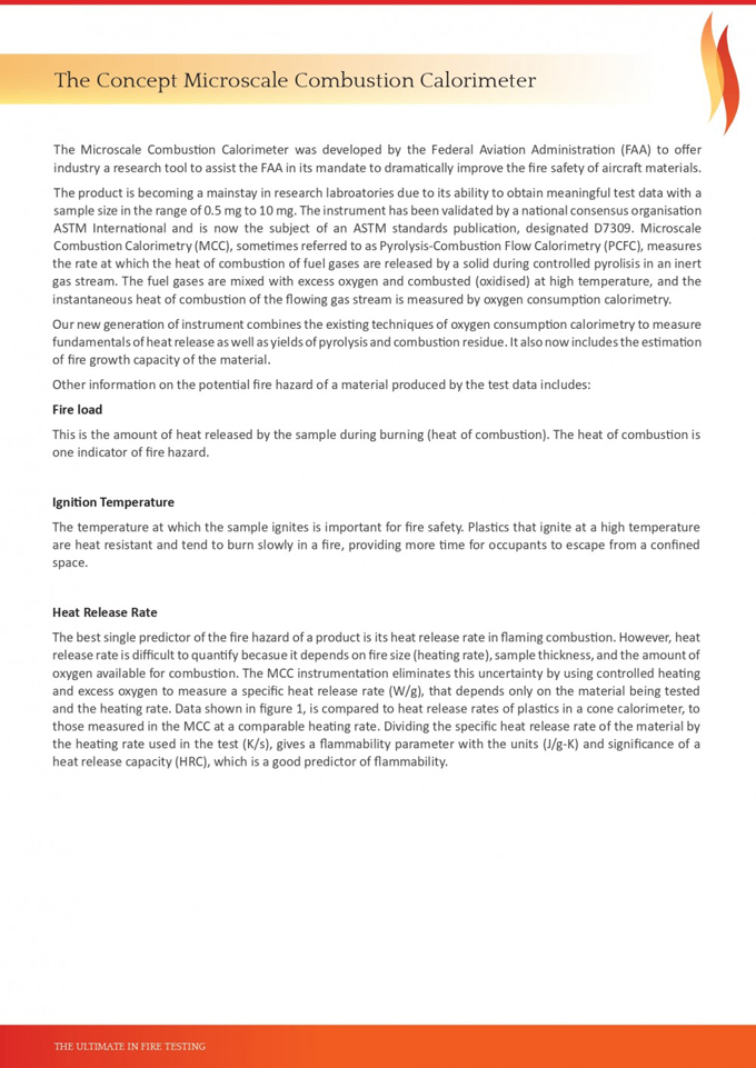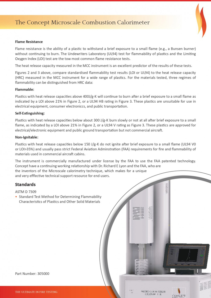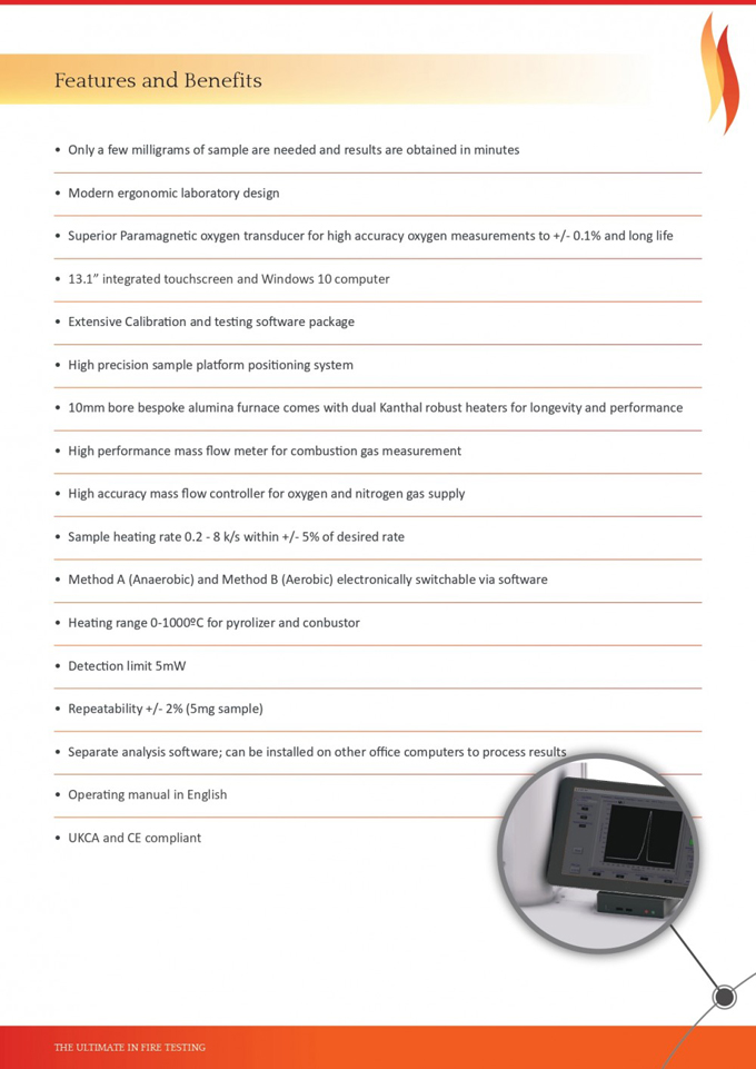 Features- 마이크로스케일 연소 열량계는 항공기 재료의 화재 안전성 테스트를 위해 개발- 0.5mg ~ 10mg 범위의 샘플 크기로 테스트 가능- ASTM International 검증 완료- D7309 ASTM 규격 준수