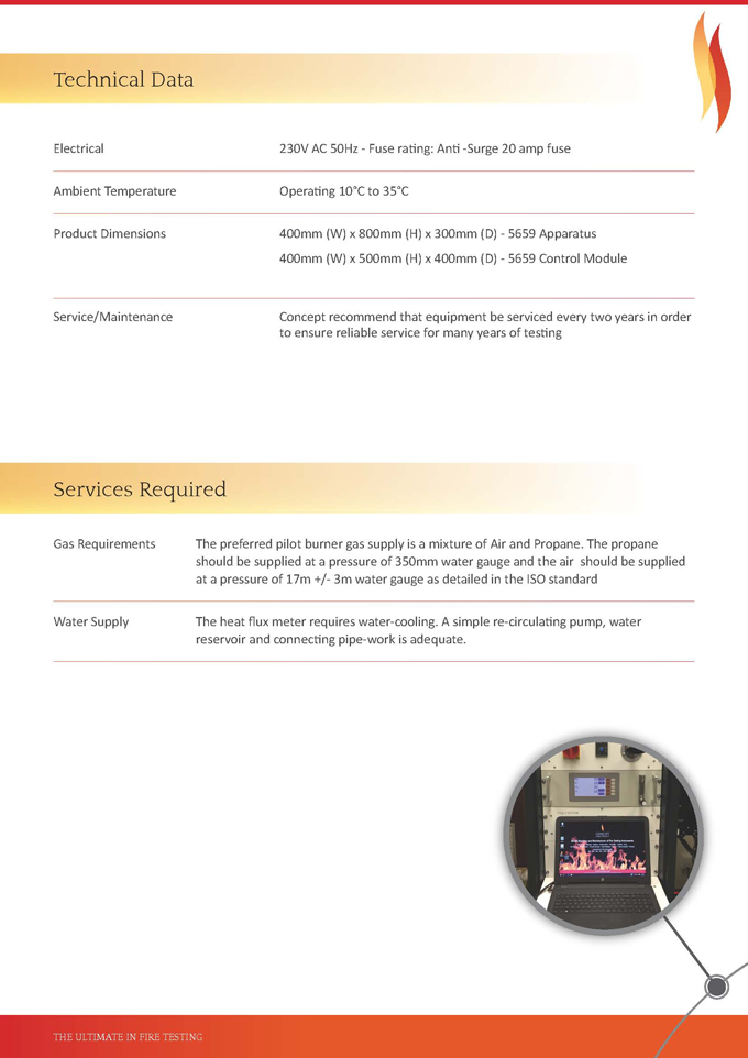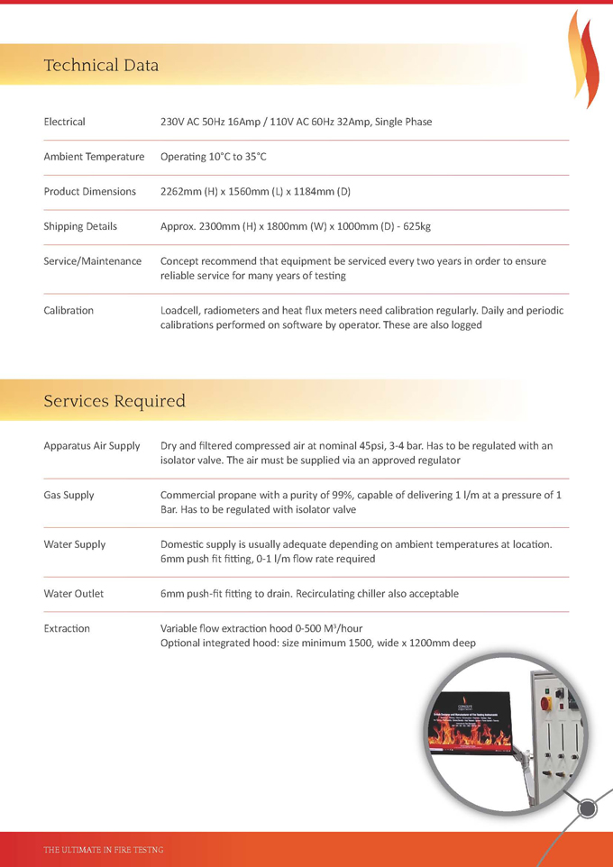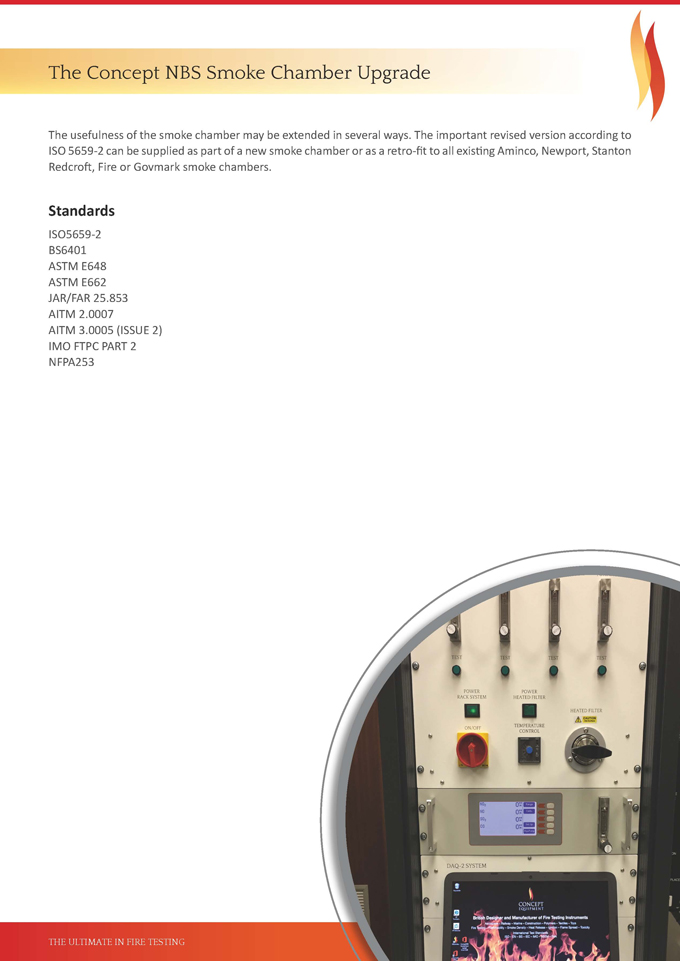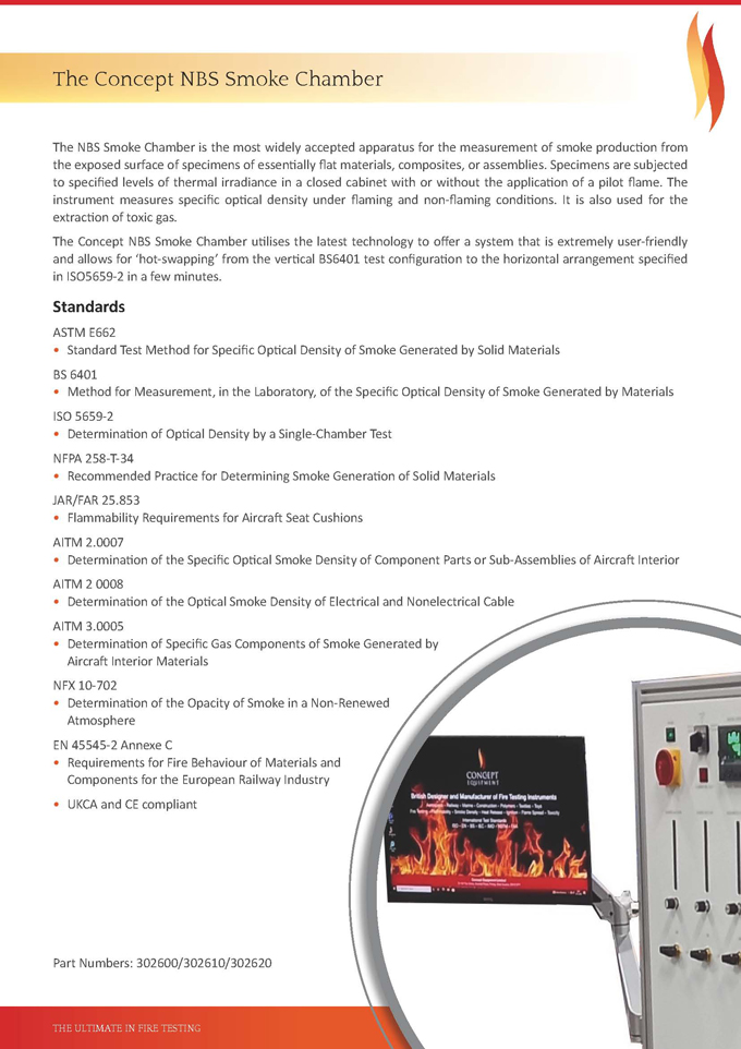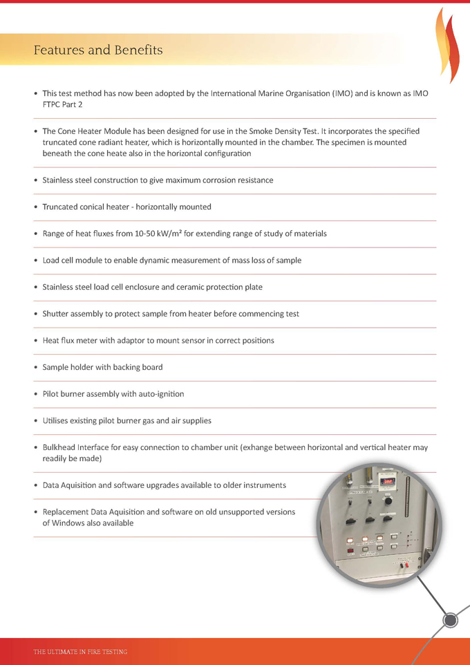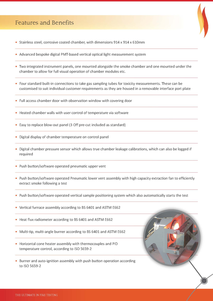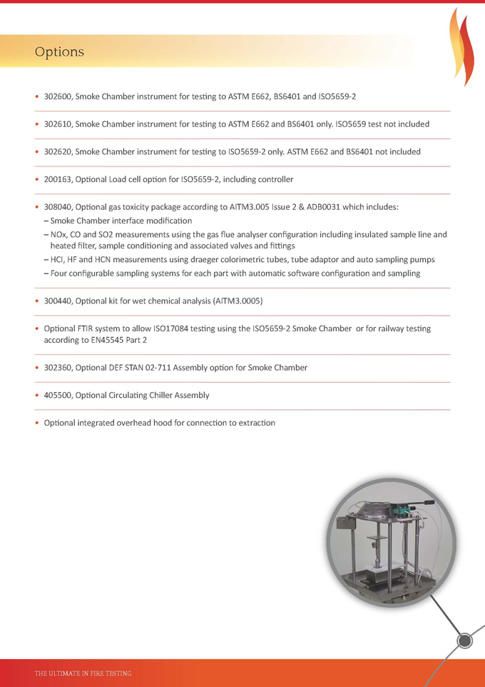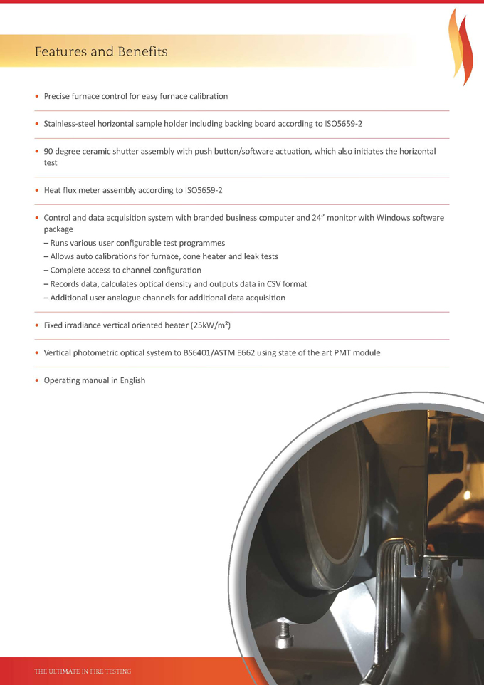 Features - 다재다능한 화재 시험 장비 - 연소 물질에서 발생하는 연기 측정 가능 - 화염 및 비화염 조건에서 특정 광학 밀도 측정 가능 - 유독 가스를 추출 후 분석 가능 - 샘플은 원뿔형 히터에 의해 수평면에 노출 - ISO 5659 Part 2, EN 45545-2 표준 시험법 등 플라스틱, 해양, 철도 응용 분야에 사용되는 제품의 평가에 사용 가능 - BSS 7239 및 AITM 3.0005 방법을 준수하는 독성 챔버 옵션 사용 가능 - FT-IR 분석기를 추가 후 독성 측정 가능 - 인체공학적인 디자인 - 사용자 친화적인 소프트웨어 설계