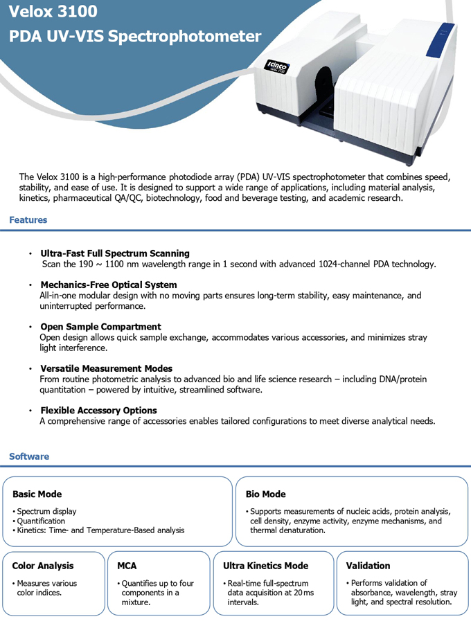 Features - 신코의 해리티지 분광광도계 모델인 S-3100의 후속모델 - 최적화된 1024개의 Photo Diode와 Tungsten & Deuterium Lamp가 탑재 → 전 파장 초고속 측정 (1초 이내) → 뛰어난 정확성과 재현성 확보 - 기기 내 Moving Part를 제거하여 뛰어난 내구성 확보 - Multi-Channel Detector 탑재로 뛰어난 파장 재현성 - 산란광(Stray Light)의 영향을 받지 않아 시료부가 개방되어 있어 샘플교체가 용이 - 미세 샘플 측정을 위한 Nano Stick과 호환 가능