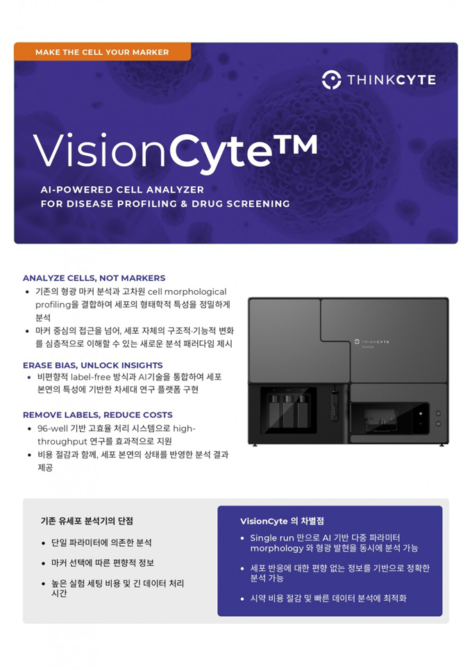 ThinkCyte VisionCyte는 세포분류에 라벨 염색이 필요없으며, 인공지능의 머신러닝을 통해 세포의 분석을 자동적으로 수행하여 연구실의 생산성과 분석 재현성을 크게 향상시켜줍니다.