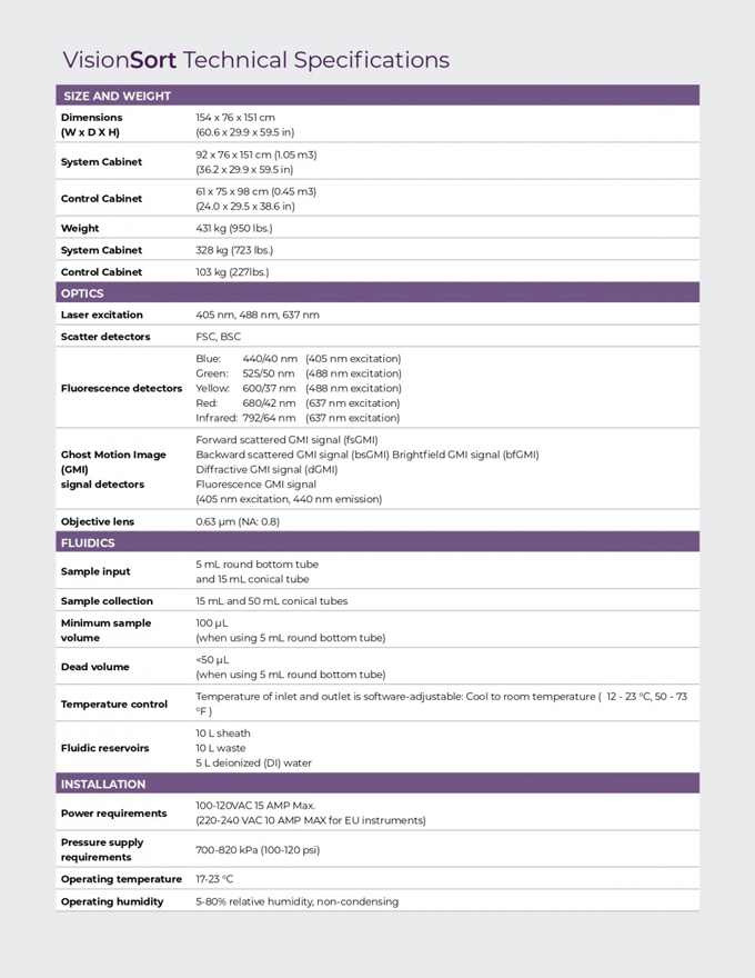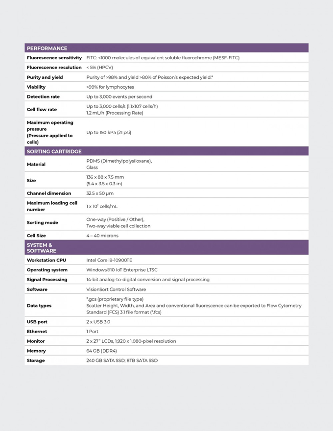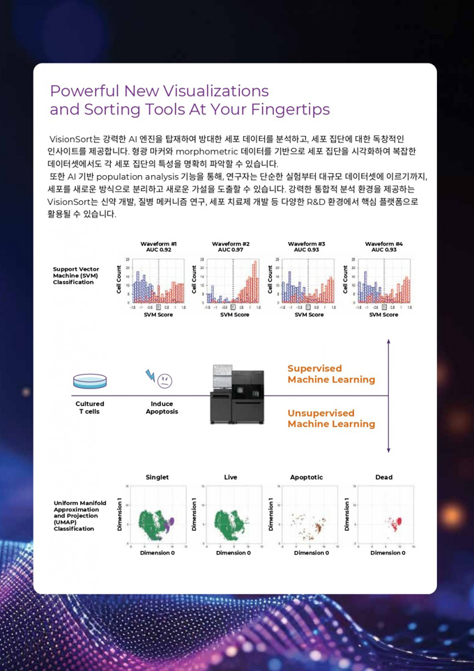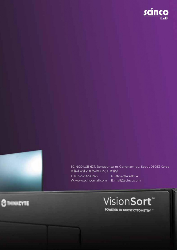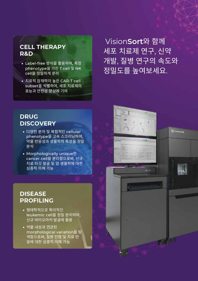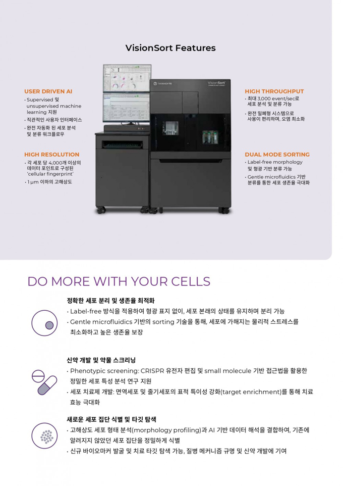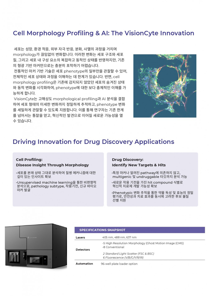 Features - 한번의 Run으로 AI Driven Multiparameter Morphological 분석 + Fluorescence 분석 가능 → 정확한 세포 상태 파악 가능 - Label Free분석 가능 → 세포 반응에 대한 Unbiased Information 제공 - 96 Well을 지원하여 High Throughput 실현 → 비용절감 및 빠른 데이터 분석 가능 - 사용자 친화적인 소프트웨어 UI - Flow Cytometer인 VisionSort 대비 합리적인 가격